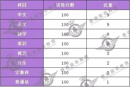 而每一科的占分比重卻各有不同,主科中、英、數占的比重為9;常識為6;視覺藝術占3;音樂占2;而宗教和普通話分別占2和1。這個占分比重在每次考試中都相同。
