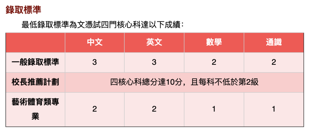 一般最低錄取要求是“3、3、2、2”,即中國語文科(3)、英國語文科(3)、數學科(2)、通識教育科(2)。藝術和體育類專業的學生要求還會再低一些。