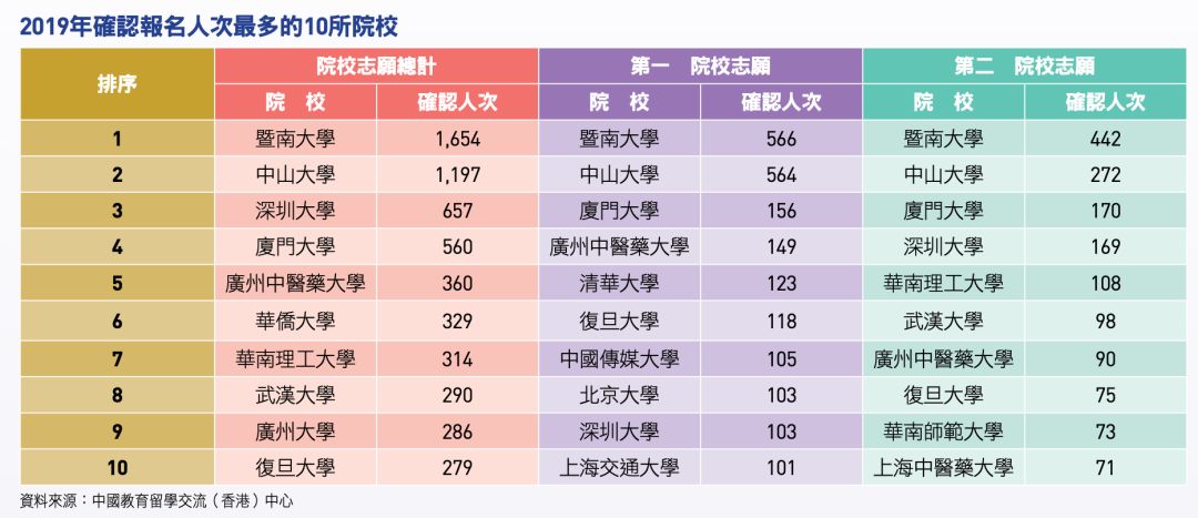 根據去年的報名情況,港生最喜歡的前三所院校為暨南大學,中山大學和深圳大學。