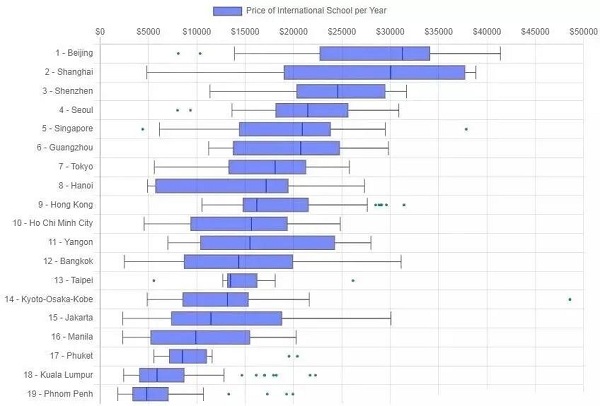 據(jù)International Schools Database發(fā)布的亞洲國際學(xué)校學(xué)費排名,北京、上海、深圳占據(jù)了榜單前3名。新加坡第5,廣州第6,香港則排第9。