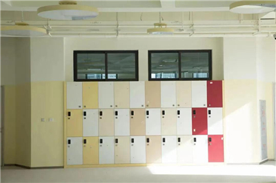 教室四面墻都不是白墻,而是可見的學習空間。每個教室門口都設置了幾排書包柜,學生用智能手環“嘀”一下就能開柜。而且孩子的手環還能擁有很多用處,進出宿舍、用餐……