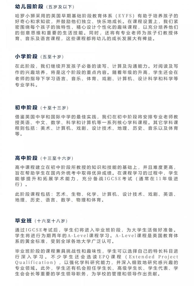 哈羅國際為純英式學校,課程設計按年級分為:英國早期基礎階段教育體系、IGCSE、A-level課程等。