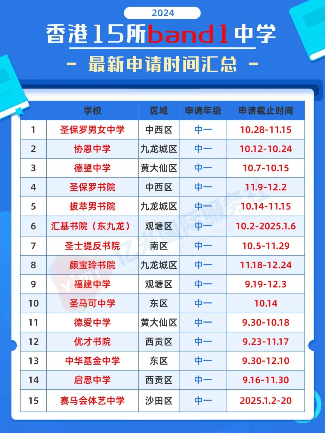 億米知道各位家長都想為孩子申請名校,除了圣保羅男女中學,現在還有眾多學校陸續開放中一申請通道,因此特意匯總了15所band1中學的申請信息以供參考: