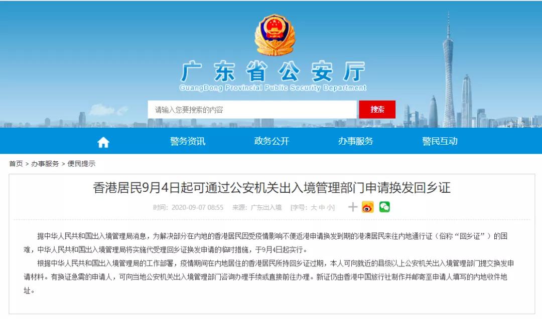 2020年9月4日起,廣東省公安廳轄下各出入境大廳將開放辦理回鄉(xiāng)證功能,疫情期間在內地居住的香港居民所持回鄉(xiāng)證過期,本人可向就近的縣級以上公安機關出入境管理部門提交換發(fā)申請材料,無需再返港到中旅社辦理。