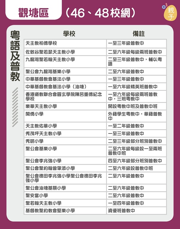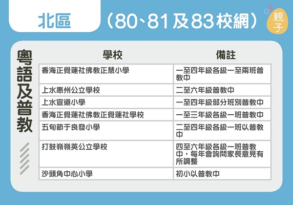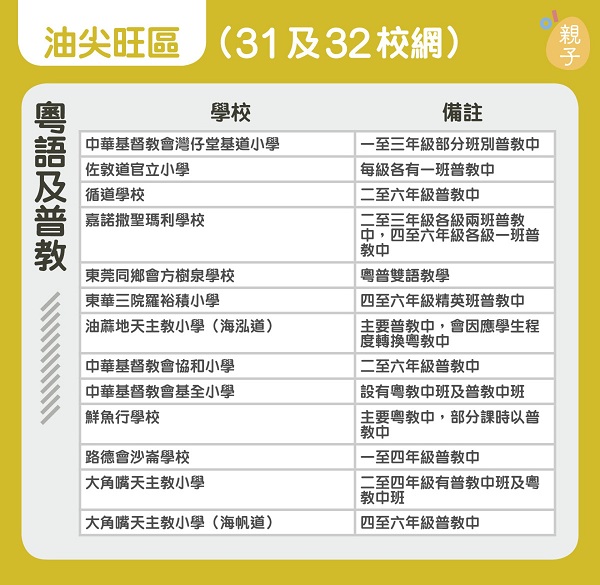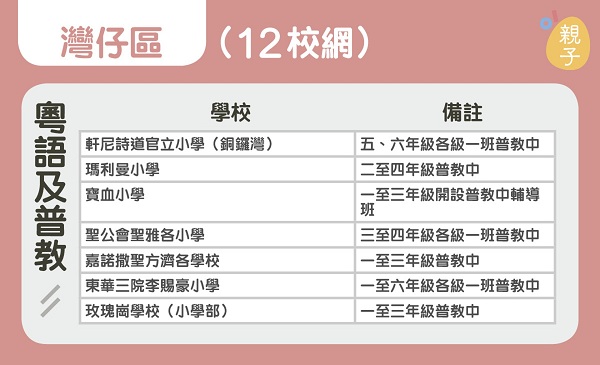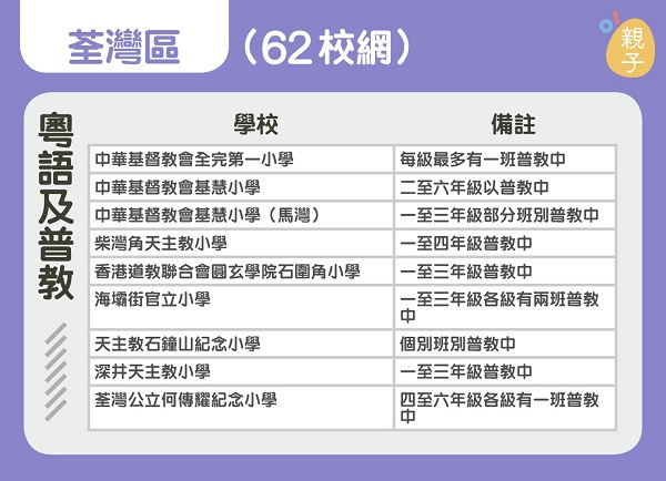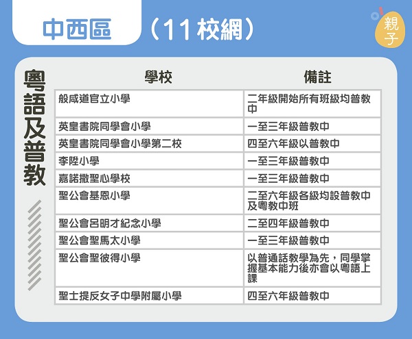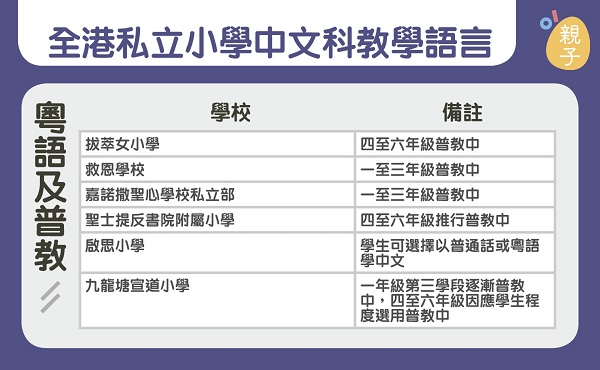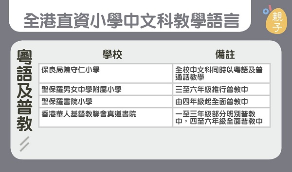記者逐一向全港所有直資、私立、資助及官立小學(xué)查詢各校中文科教學(xué)語言,以下是以粵語及普通話同時教學(xué)的小學(xué)名單: