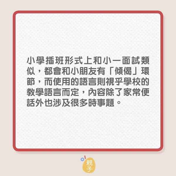 兒童發(fā)展及升學(xué)專家Ken Sir以自身小學(xué)插班經(jīng)驗分享,形式上和小一面試類似,都會和小朋友有「傾偈」環(huán)節(jié),而使用的語言則視乎學(xué)校的教學(xué)語言而定,內(nèi)容除了家常便話外也涉及很多時事題。