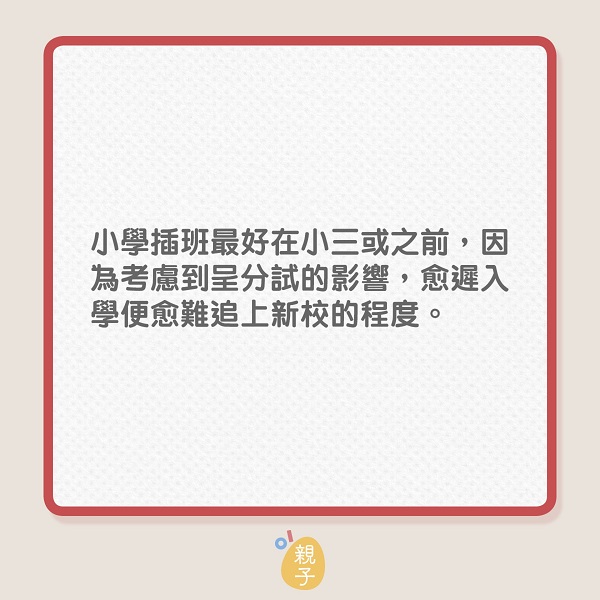 筆試方面,當(dāng)時自己小朋友是插班讀四年級,校方則會安排小朋友做當(dāng)年三年級下學(xué)期的卷去評定小朋友學(xué)術(shù)能力,因此如果家長有意插班,可向就讀該校的家長了解一下試卷程度。最后Ken Sir建議,轉(zhuǎn)校時一定要考量小朋友意愿,畢竟插班要小朋友重新認識朋友、新環(huán)境,老師都要花時間了解他,魯莽轉(zhuǎn)校只會弄巧成拙,一般而言,小學(xué)插班最好在小三或之前,因為考慮到呈分試的影響,愈遲入學(xué)便愈難追上新校的程度。