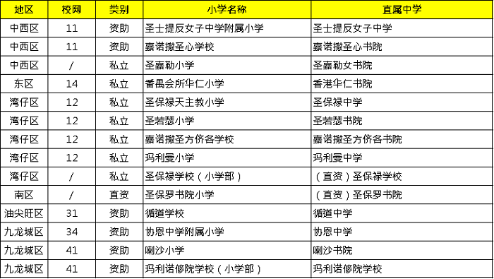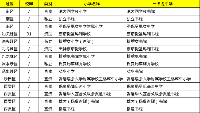 除了「一條龍」,還有資助和官立學??梢杂心硞€百分率%可以直升。直屬學校如喇沙小學的六年級生,在扣除「自行分配.和「重讀生」,在剩余約(100-55=)45%學額,保留85%學額直升上其直屬中學,喇沙書院。聯系學校(多為官立或慈善團隊辦的學校)像直屬扣除自行分配學位后,剩余的45%學額,保留25%學額直升上其聯系中學,例如軒尼詩官立小學有某個百份比(視乎有多少所小學)直升上皇仁書院(男)或庇理羅士女子中學(女)等。