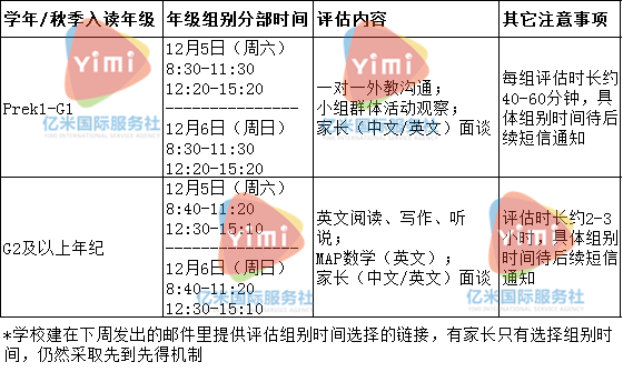G2及以上年級考試的時間為:12月5日或12月6日的8:40-11:20/12:30-15:10,評估內容為:英文閱讀、寫作、聽說;MAP數學測試(英文);家長(中文或英文)面談,每組評估時間約為2-3小時。具體以家長們收到的短信通知為準。