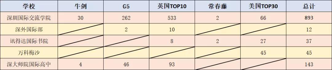 深國交辦學17年以來,15屆畢業生里共有205人被牛劍錄取,年年位居全國第一,而今年牛劍的錄取更是突破30人大關,再次創下新紀錄。深中、深外等其他學校在牛劍的錄取還是很不錯的。深圳不少國際學校呈向上走的趨勢,當然也有不少的國際學校呈向下走的趨勢。