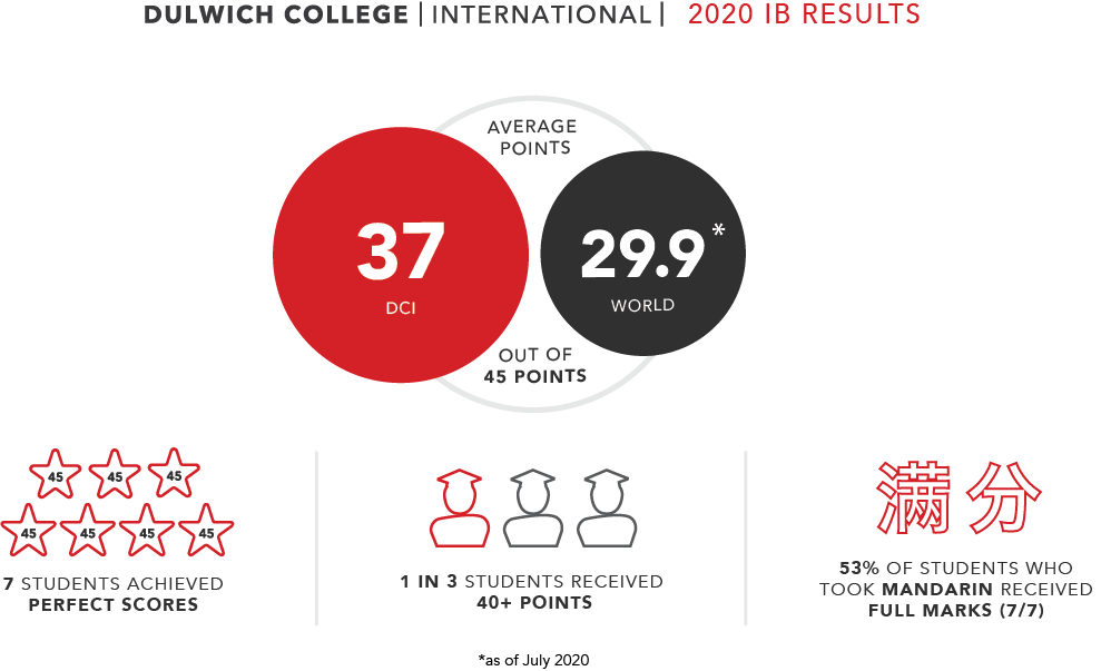上海德威的升學成績也非常亮眼,據官網披露,德威2020級學生參加IB課程考試的合格率為100%,64名學生均順利通過了考試,且平均分為37分,遠遠高出29.9的全球平均分。