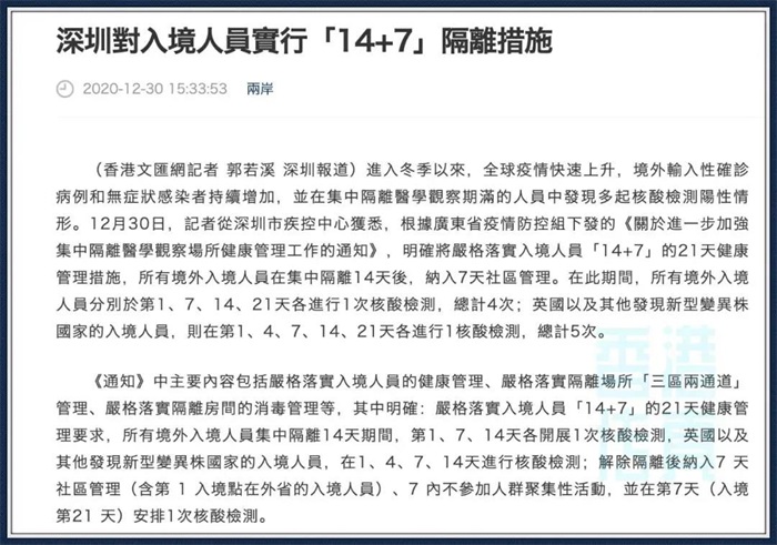 繼昨天報道《突發!深圳收緊過關政策!香港入境要提前預約!》后,深圳又收緊了隔離政策,將嚴格執行“14+7”的21天健康管理措施!!