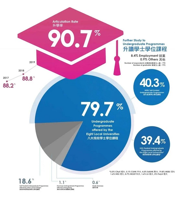 如果你的英語不合格,你還可以考慮副學士。香港浸會大學副學士的官網數據表明,90.7%的學生成功升讀學士學位,79.7%的學生成功升讀香港八大名校。