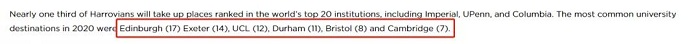 2020年畢業(yè)生進(jìn)入的大學(xué)中,英國大學(xué)最多的幾個學(xué)校分別是:杜倫大學(xué)(13),埃克塞特大學(xué)(13),倫敦國王學(xué)院(11),倫敦大學(xué)學(xué)院(9),布里斯托大學(xué)(7),帝國理工學(xué)院(7),倫敦政治經(jīng)濟(jì)學(xué)院(7),曼徹斯特大學(xué)(7),牛津大學(xué)(5),劍橋大學(xué)(1)……