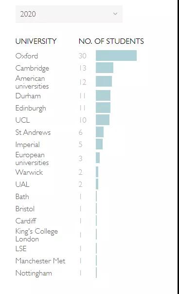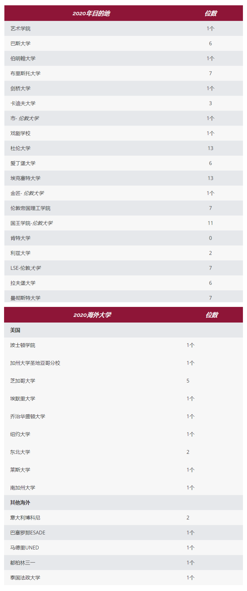 2020年畢業(yè)生進(jìn)入的學(xué)校:牛津大學(xué)(30),劍橋大學(xué)(13),達(dá)勒姆(11),愛丁堡(11),倫敦大學(xué)學(xué)院(10)……