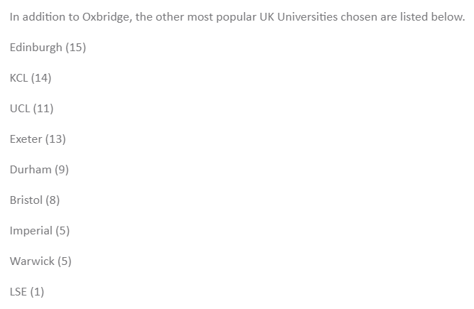 除劍橋牛津之外,當(dāng)年畢業(yè)生選擇的熱門學(xué)校如下: