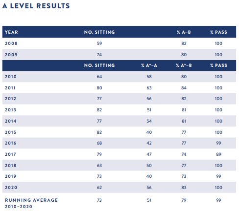 2020年A-level成績:超過2/3的學(xué)生取得A*-A的成績,7名學(xué)生取得5門及以上A*的成績,44名學(xué)生取得3門及以上A*的成績。