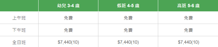 學校有參加「幼稚園教育計劃」,以下列出扣減政府資助后不同班別的全年學費和期數