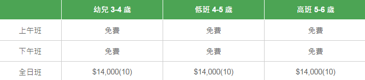 學校有參加「幼稚園教育計劃」,以下列出扣減政府資助后不同班別的全年學費和期數。