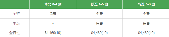 學校有參加「幼稚園教育計劃」,以下列出扣減政府資助后不同班別的全年學費和期數。