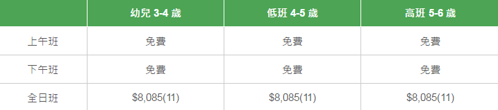 學校有參加「幼稚園教育計劃」,以下列出扣減政府資助后不同班別的全年學費和期數。